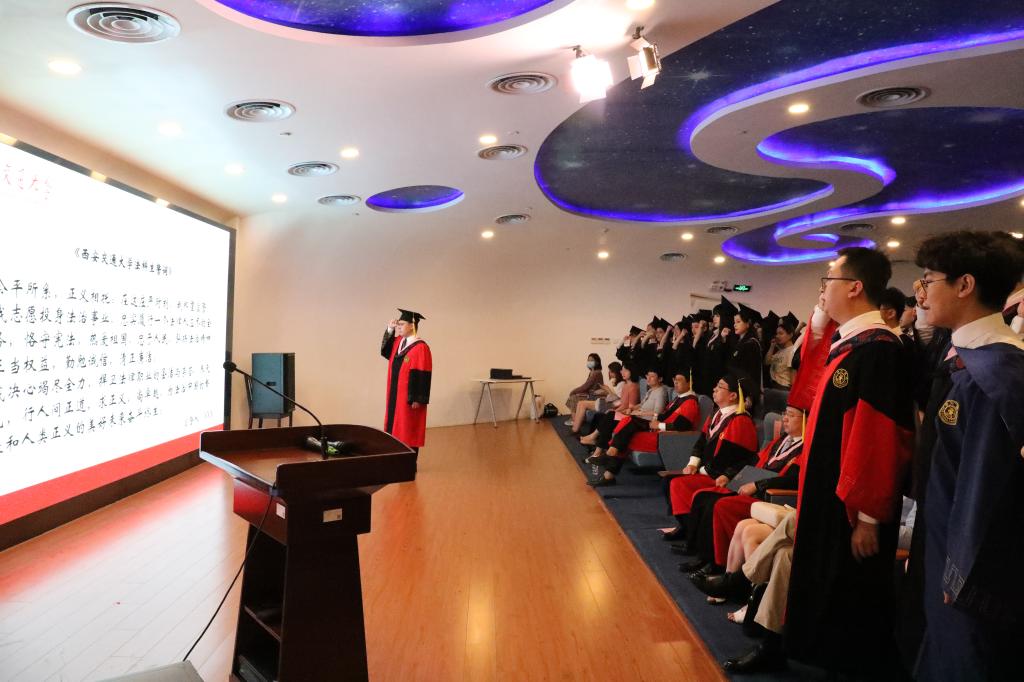 宣誓环节,丁卫副院长带领安博在线客服2021届全体毕业生宣读法科生誓词。全体毕业生宣誓将竭尽全力,捍卫法律职业的圣洁与荣誉,养天地正气,行人间正道,求正义,尚卓越,为法治中国的繁荣发展和人类正义的美好未来奋斗终生。