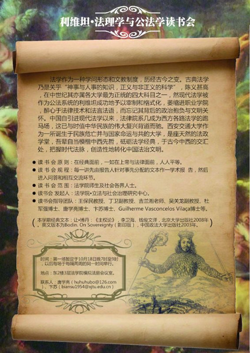 基于以上种种考量,并配合学校“思想交大”建设和学院法理学和公法学的学科建设,安博在线客服“立法与社会治理研究中心”发起创办“利维坦·法理学与公法学读书会”系列活动。本学期该活动选取的经典文本为让·博丹的《主权论》,并于10月18日晚7时在学院会议室举行了首场活动,安博在线客服丁卫副教授、吉兰湘老师、彭何利博士、苏青博士、王朝恩博士、卞苏博士、唐学亮博士等10余位师生参加。主权理论是现代民族-国家兴起的理论前提,而民族-国家又是现代社会最重要的一个政治与法律现象,并与中国近代以来持续至今的伟大而艰难的国家转型勾连起来,因此,不得不察。在该场读书会活动中,主讲教师唐学亮针对博丹《主权论》一书的“导论”部分,就“为什么读博丹?”、“怎么读博丹?”、“博丹的思想里程与理论建构”以及“博丹理论的缺陷”等四个方面做了一个提纲挈领而又不失理论深度的学术报告。之后,就报告的内容及书中所启示的一些重大理论与现实问题,与会人员各自发表了自己的看法,并展开了热烈的讨论。首场读书会活动取得了预期的效果,我们将在两周后的同一时间举行第二场活动。“路漫漫其修远兮,吾将上下而求索”!