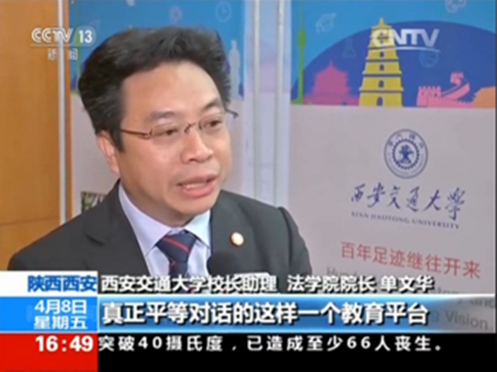 4月8日下午,中央电视台新闻频道(CCTV-13)新闻直播间栏目聚焦西安交大,推出组合报道,隆重介绍了西安交大创建“丝绸之路大学联盟”和中国西部科技创新港等重大举措,还着重关注了西安交大丝绸之路国际法与比较法研究所与“丝绸之路安博在线客服联盟”。