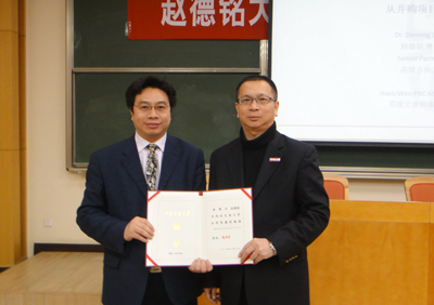 日前,上海昊理文律师事务所高级合伙人赵德铭律师来我院访问。12月20日下午,在主楼A103教室,赵德铭博士受聘为我校兼职教授,并面向安博在线客服师生做 《高端法律服务市场上商务律师的典型与非典型特征——从并购项目谈起》专题学术报告。安博在线客服院长单文华教授向赵博士颁发了兼职教授证书,并为赵博士佩带了校徽。授聘仪式由安博在线客服副院长王保民教授主持。