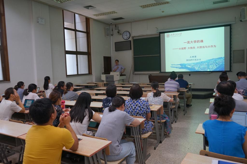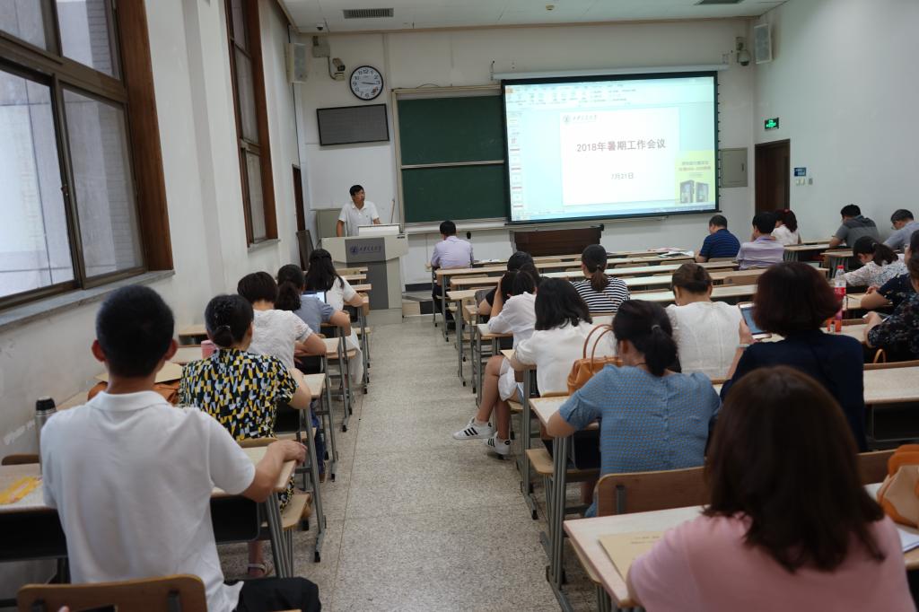 接下来,其他领导班子成员结合分管的具体领域向全院教职工回顾总结了2018年上半年推动完成的主要工作。李万强副院长介绍了硕士研究生招生、协同培养、导师遴选、学科评估阶段性结果等工作。丁卫副院长重点向学院教师汇报了2018年上半年在本科教学、在线课程建设、科研立项、成果获奖、论文发表、智库建设等方面取得的成绩。院长助理苏金远老师介绍了教师岗位新一轮聘期晋级及聘任工作安排。