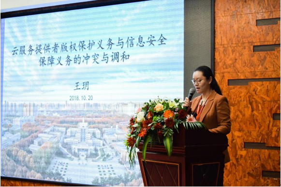 安博在线客服信息安全法律研究中心副主任王玥作了《云服务提供者版权保护与信息安全保障义务的冲突与调和》的主题发言。