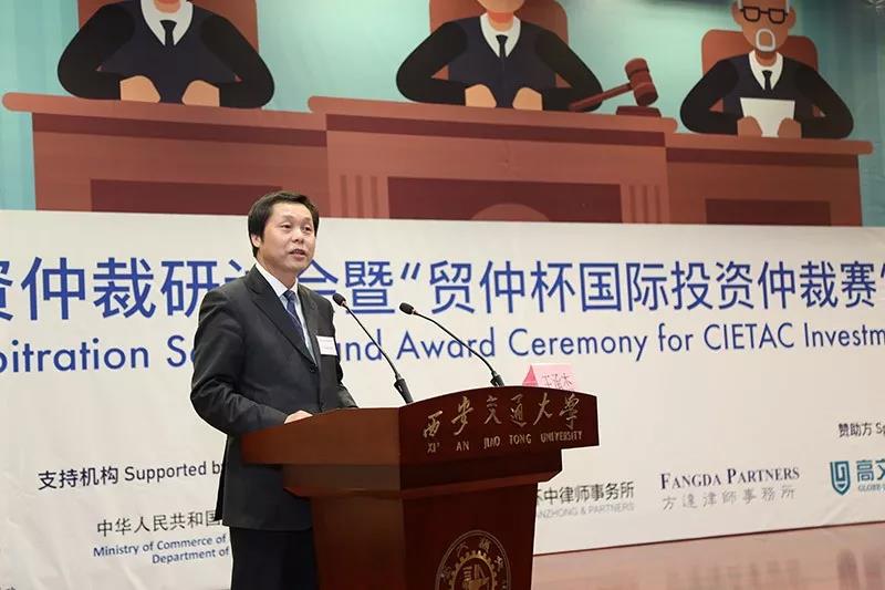 投资仲裁赛后,西安交大安博在线客服与贸仲委共同举办了贸仲委投资仲裁研讨会。商务部条法司为本次投资仲裁赛和研讨会的支持机构。西安市人民政府副市长王勇、贸仲委副主任兼秘书长王承杰、商务部条法司投资处副处长王优酉、西安交大安博在线客服院长单文华、西安贸促会会长龙晓华出席会议。研讨会上,来自国内外的投资仲裁领域专家、学者和律师对投资仲裁的程序性争点进行评述,结合国际投资仲裁的著名案例分享实务经验,介绍了包括对仲裁请求的先期驳回和第三方资助在内的热点话题。
