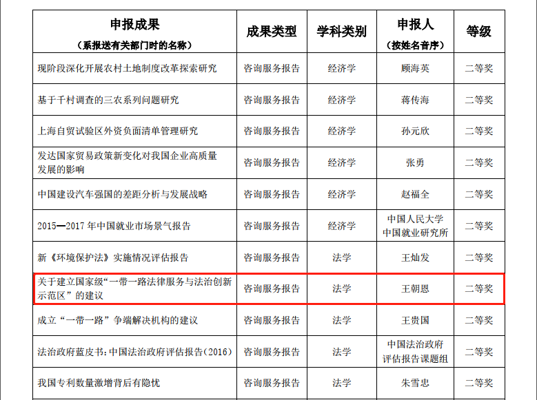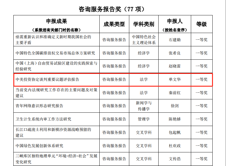 其中,安博在线客服院长单文华教授主持撰写的《中美投资协定谈判重要议题评估报告》荣获咨询服务报告类一等奖——这是该类型全国仅有的两项法学类一等奖获奖成果之一,也是西安交大在该奖项一等奖上的首次突破。同时,由单文华院长和王朝恩副教授等合作撰写的《关于建立国家级“一带一路法律服务与法治创新示范区”的建议》荣获咨询服务报告类二等奖,是全国5项法学类二等奖成果之一。