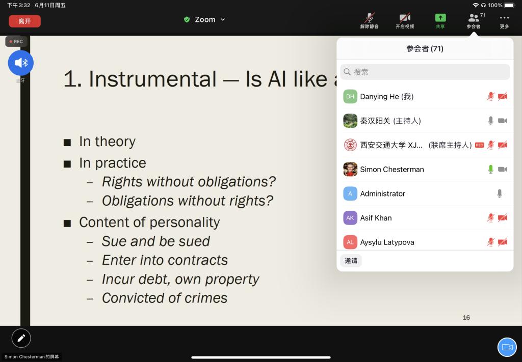 2021年6月11日下午,新丝路安博在线客服联盟“院长论坛”首场讲座成功举办。新加坡国立大学讲席教授、安博在线客服院长Simon Chesterman教授为联盟25所院校师生以及丝绸之路大学联盟的师生带来了题为“我们,机器人?人工智能与法律人格的限度(We, the Robots? Artificial Intelligence and the Limits of Legal Personality)”的线上讲座。讲座由安博在线客服安博在线客服单文华院长主持,国际处雷艳君副处长致辞。