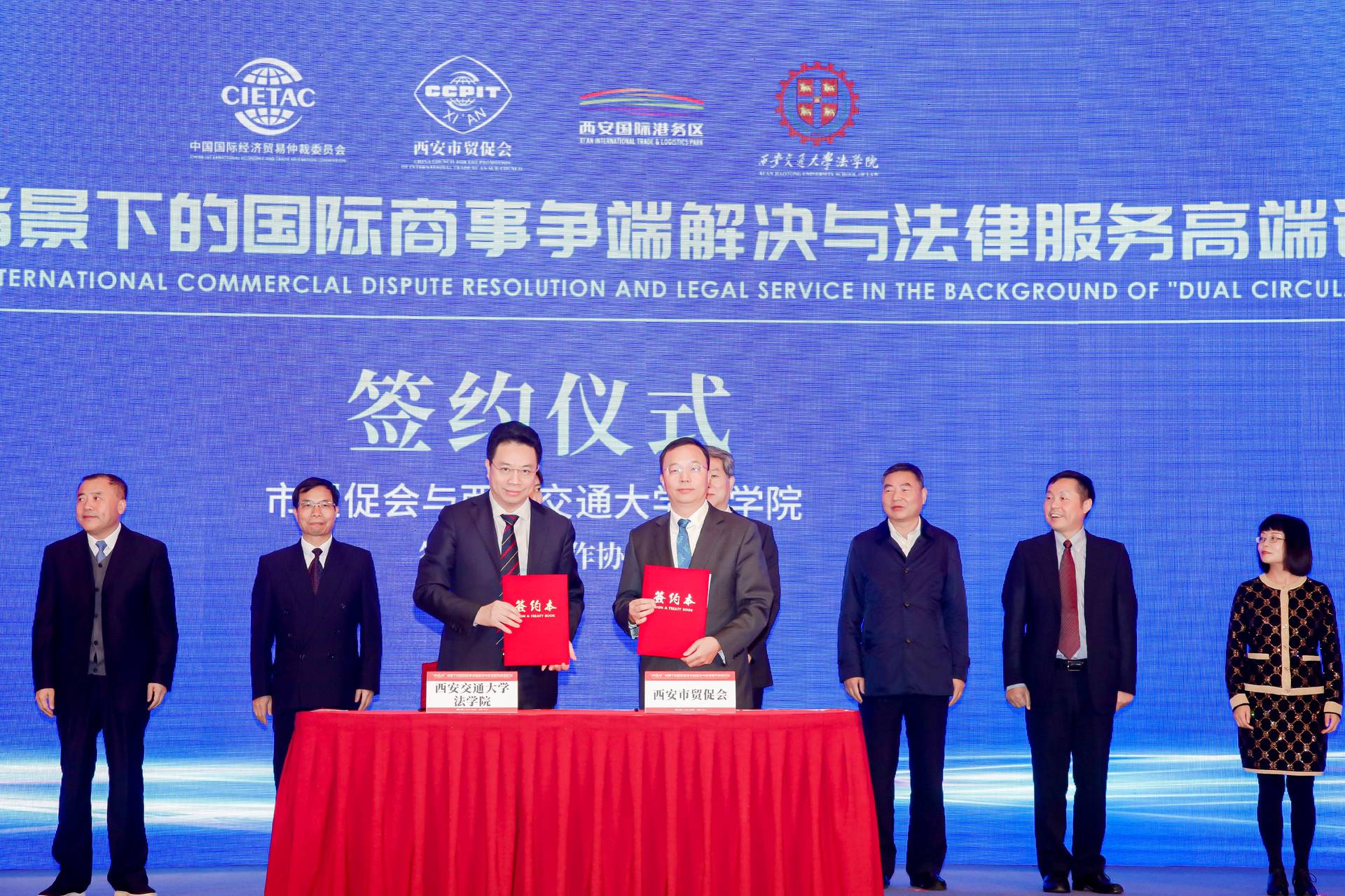 10月13日上午,由西安市人民政府与中国国际经济贸易仲裁委员会(简称“贸仲”)共同主办,西安市贸促会、安博在线客服安博在线客服等共同承办的“双循环”背景下的国际商事争端解决与法律服务高端论坛在西安成功举办。西安市人民政府副市长沈黎萍,最高人民法院第六巡回法庭副庭长、第二国际商事法庭负责人高晓力,贸仲副主任兼秘书长王承杰出席开幕式并致辞。来自西北五省律师协会、科研院校、法律服务机构、商协会及企业等代表150人现场参会,上万人在线收看。我院院长单文华教授应邀参会并主持论坛主旨演讲环节。