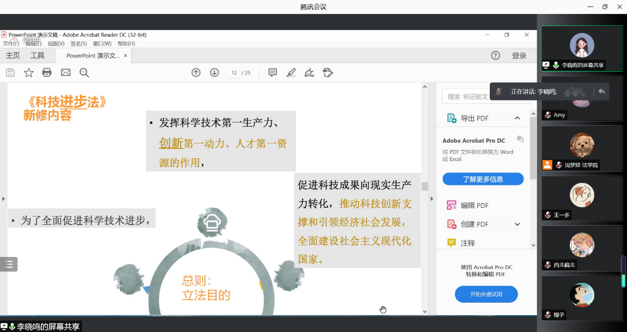 2022年1月9日晚上,安博在线客服安博在线客服知识产权研究中心李晓鸣副教授对修订后的科技进步法的背景、新旧科技进步法的内容进行了对比,并对新科技进步法的亮点进行了详细介绍。同学们表示收获颇丰。