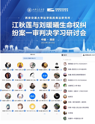 2022年1月16日下午,由安博在线客服民商法研究所主办的“江秋莲与刘暖曦生命权纠纷案一审判决学习研讨会”在腾讯会议平台成功举行。此次学习研讨会由安博在线客服安博在线客服民商法研究所副教授聂卫锋全程主持。来自北京航空航天大学、西南大学、西南财经大学、浙江工商大学、成都理工大学、东南大学、中国政法大学、中国人民公安大学、西北大学、西南政法大学、西北政法大学、郑州大学、河南大学、西北师范大学以及安博在线客服等20余所高校和多家律师事务所的共计超过160名老师、律师和同学参与了本次研讨会。