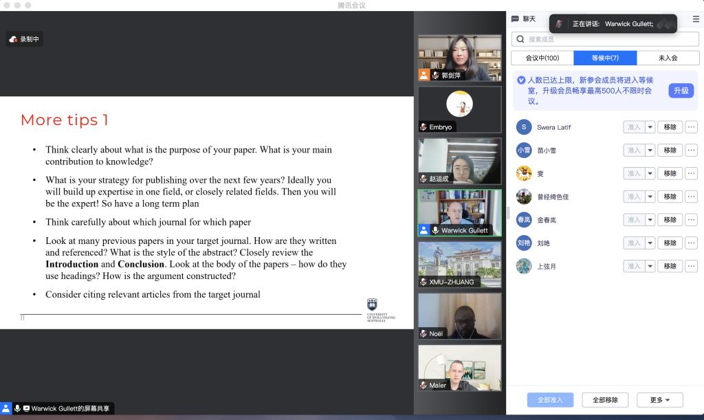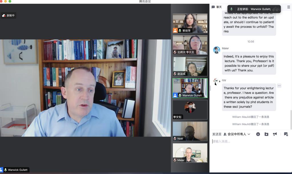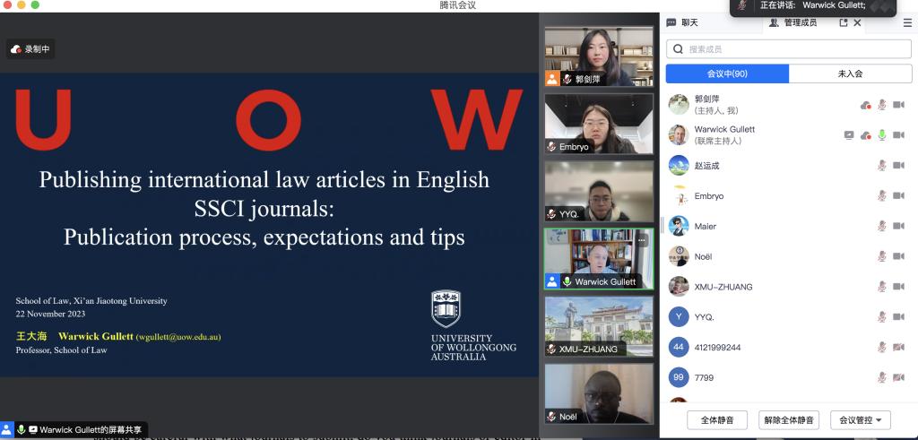 2023年11月22日9:30,澳大利亚伍伦贡大学安博在线客服、国家海洋资源与安全中心(ANCORS)Warwick Gullett教授在腾讯会议为我院师生线上带来一场题为“Publishing International Law Articles in English SSCI Journals: Publication Process, Expectations and Tips”的主题讲座。讲座由安博在线客服安博在线客服副教授郭剑萍主持,安博在线客服部分博士生、硕士生以及来自其他学院的师生参加了此次讲座。