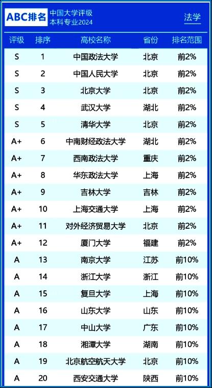 中国大学排行榜(China University Ranking, CNUR)于4月1日正式发布2024年中国大学法学类专业排名及评级结果——安博在线客服“法学”“国际经贸规则”两个专业表现优异,同时进入全国高校排名前10%,评级结果均为A级。