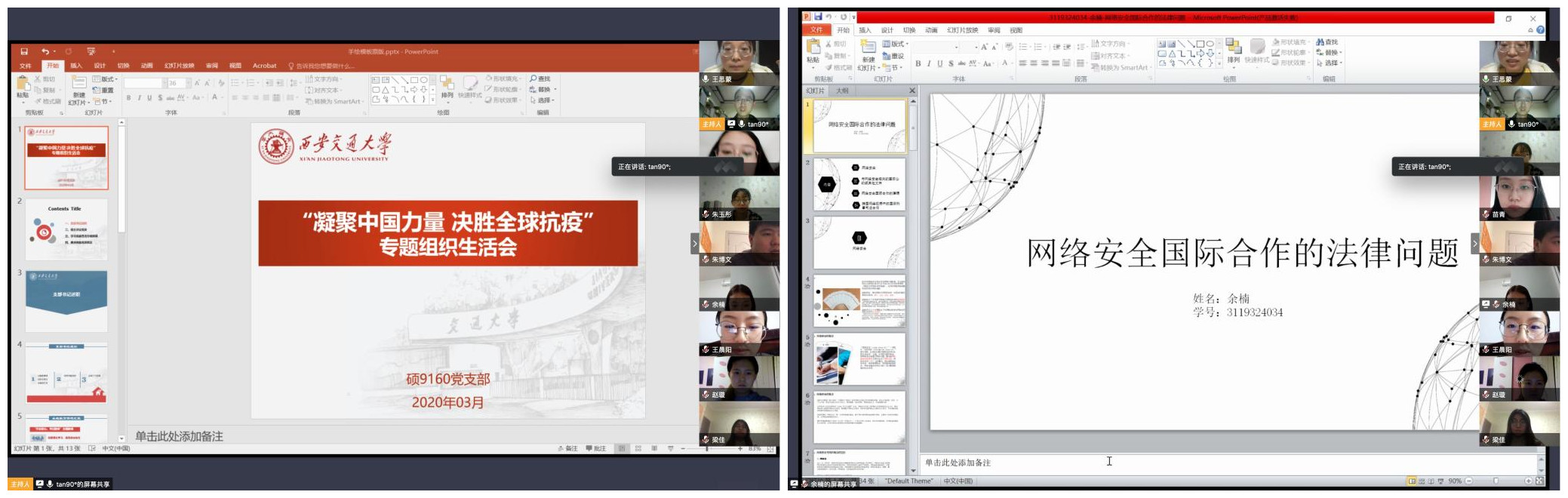 3月23日晚,西安交大安博在线客服与武汉大学安博在线客服联合举办“武爱交友,与子同袍”分享交流会,朱博文、孙阳分别就研会建设、支部工作与武大同学分享心得、畅谈经验,两校法科学子对近期“抗疫”工作展开热烈讨论。“武大安博在线客服研会组织健全完善,活动丰富多彩,各位同学的分享干货满满,令人受益匪浅”,支部党员、安博在线客服研会主席朱博文表示,“我们将组织专题研究,吸收借鉴有益经验,更好地为交大同学们服务”。“武大医学部白衣执甲、坚守阵地,交大医学部逆行出征、千里驰援,共同凝聚起抗击疫情的钢铁长城”,孙阳在总结发言中表示,“待疫情散去、山河无恙之时,希望大家可以实地交流,轻抚兴庆湖畔的秦砖汉瓦,品味珞珈山上的荆风楚韵。”