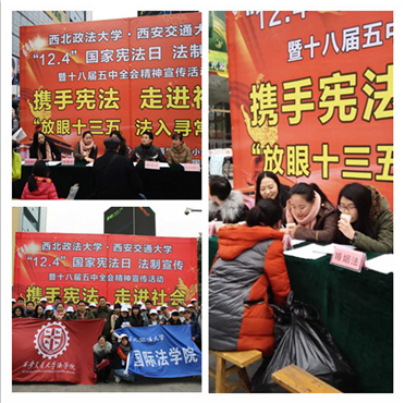 让守宪成为国民每天的生活方式”是实现法治中国建设的基本保障。为了普及宪法知识,推动全社会知法、用法、守法、护法意识的形成,安博在线客服安博在线客服与西北政法大学国际安博在线客服共同在西安市雁塔区飞炫广场举办了主题为“法入千万家”普法宣传活动,通过分发法律宣传单、法律意识调查问卷、法律咨询、普法广播等形式,吸引了大批市民的关注。在法律咨询服务点,许多市民前来咨询,咨询内容涉及婚姻法、劳动合同法、民法等领域,包括离婚财产分配、离婚孩子抚养权归属、追讨薪资、借款追债等与大家生活密切相关的问题,咨询点的同学认真对待每一位前来咨询的市民,耐心回答他们的问题,赢得了一致好评。